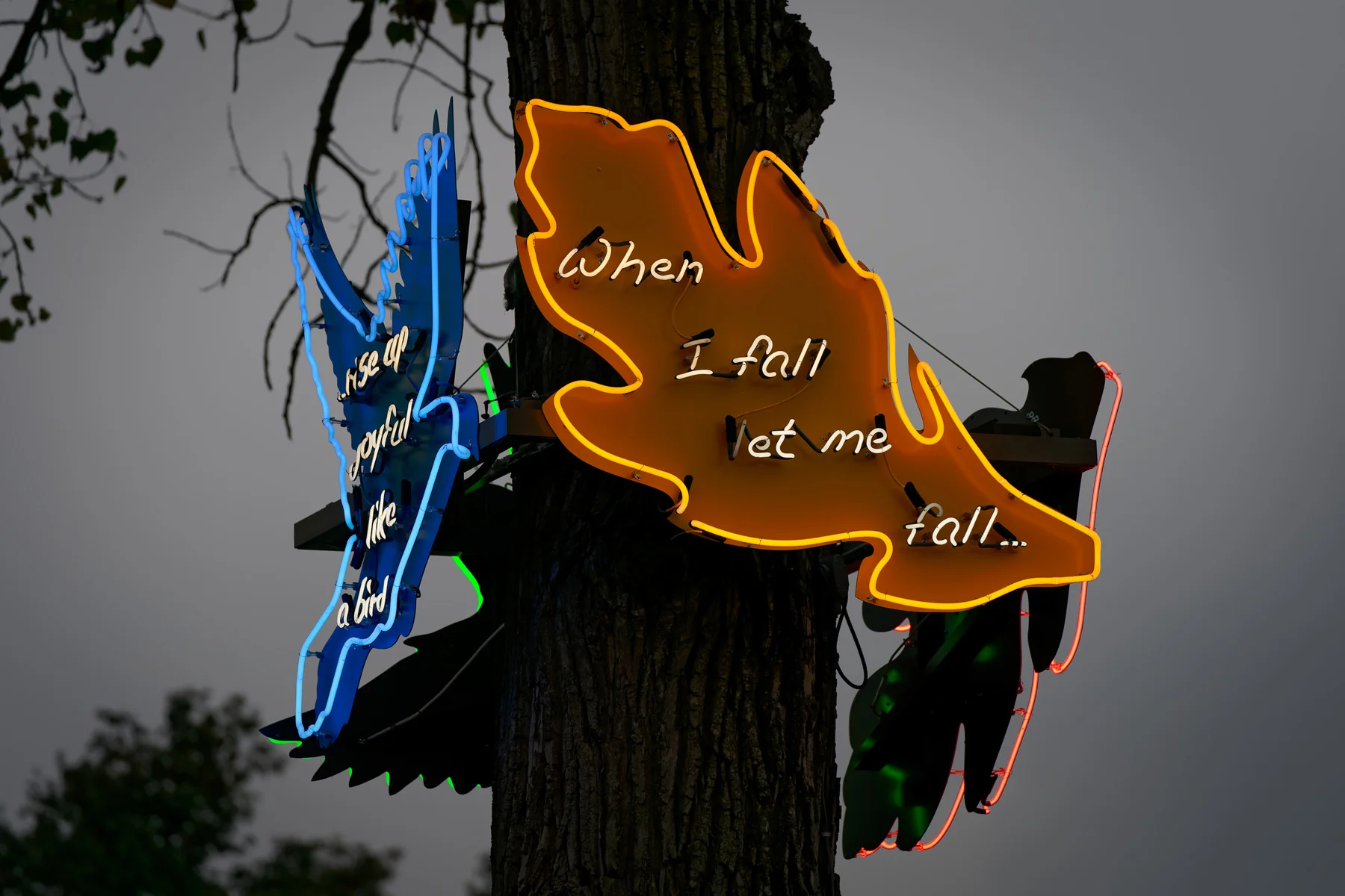 St. Louis artist David Hutson’s neon “tube bending” casts a cool, buzzing glow in the Park,expressing neon’s power as an artistic medium. Sited on a towering tree, When I Rise, 2018, is a significant text-based artwork using gaseous typography, cascading a quote from The Mad Farmer Poems by celebrated American novelist Wendell Berry: “WHEN I RISE UP LET ME RISE UP JOYFUL LIKE A BIRD. WHEN I FALL LET ME FALL WITHOUT REGRET LIKE A LEAF.” Hutson’s work speaks both literally and metaphorically about connection to place, one of Berry’s fundamental concerns, brought to life here through alchemy— a crafted language stuck to a symbol of life itself. Using the power and inspiration of nature, Hutson’s piece becomes a delightful addition to our light-based sculpture collection saturating the outdoor galleries with moments of illumination.