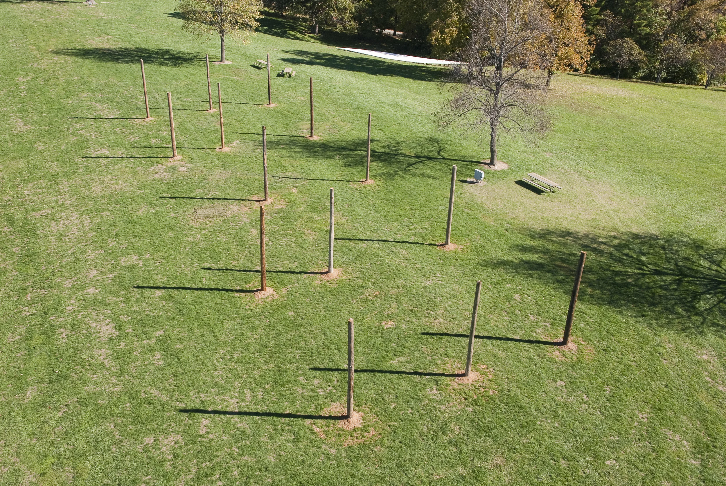 After the demolition of the towers in 1973, the remaining empty lot of several acres near downtown has, in the fullness of time, transformed into a habitat for various flora and fauna. Chávez explored the fenced-off site, increasingly intrigued by its state of disrepair a half-mile away from downtown St. Louis. Observing the number of bees that had claimed the woodland as their own, Chávez realized the sculptural comparisons between, and the metaphorical potential of, bee communities. Like the human population of St. Louis, honeybees are also on the decline, for various environmental reasons. Chávez sees the successful beehive as a metaphor for a sustainable community and an enduring civilization.