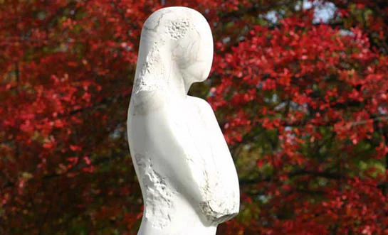 Manuel Neri peels away peripheral elements from a block of stone to arrive at the essential in a search for the expressive nature of figural form in his work Aurelia Roma, 1994. Posed serenely in the center of the pool on the Estate House Terrace, Neri’s simplified female hearkens back to the marble goddesses of Greece and Rome. He distresses the surface with studied chisel blows that define areas of texture to contrast with polished areas, creating an intentional ruin.