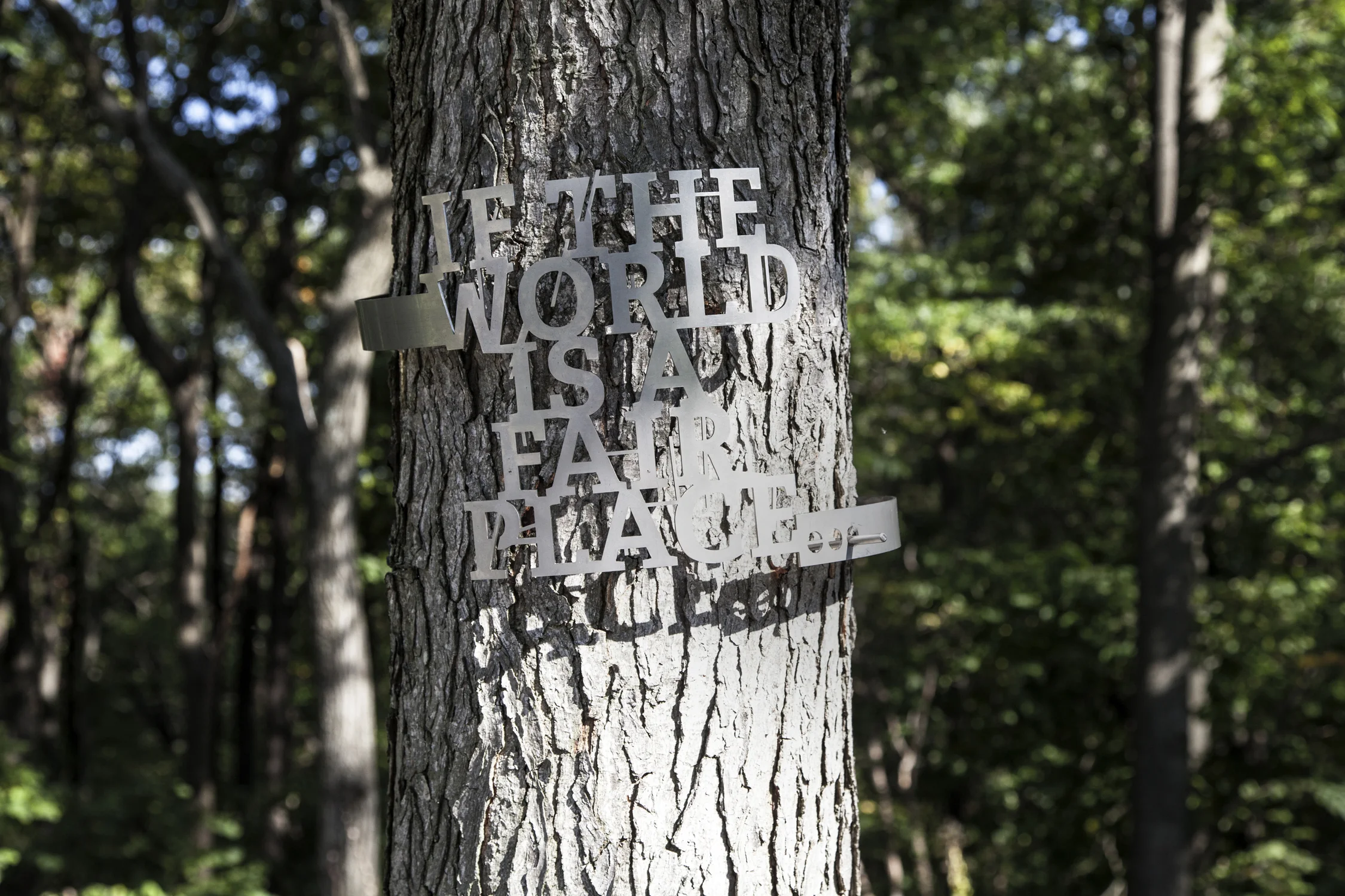 Laumeier presents an exhibition by Raqs Media Collective, a New Delhi-based cooperative with a politically charged artistic and theoretical practice. Their publicly-engaged, sculptural intervention was sparked by a visit to Laumeier, where their research on the problematic history of World's Fairs began. Laumeier initiated a research collaboration with Raqs by inviting our audience—through personal visits to the Park, online via Laumeier’s website and social media outlets, or through other Laumeier-initiated opportunities, including EXPO Chicago—to respond to the prompt, "If the World is a Fair Place, Then…" From these various outlets, Laumeier was able to gather more than 500 responses to share with the artists to inspire and help formulate their idea for a sculptural installation of 40 stainless-steel bands encircling tree trunks in the Park, plus a textual installation to open the Adam Aronson Fine Arts Center.
