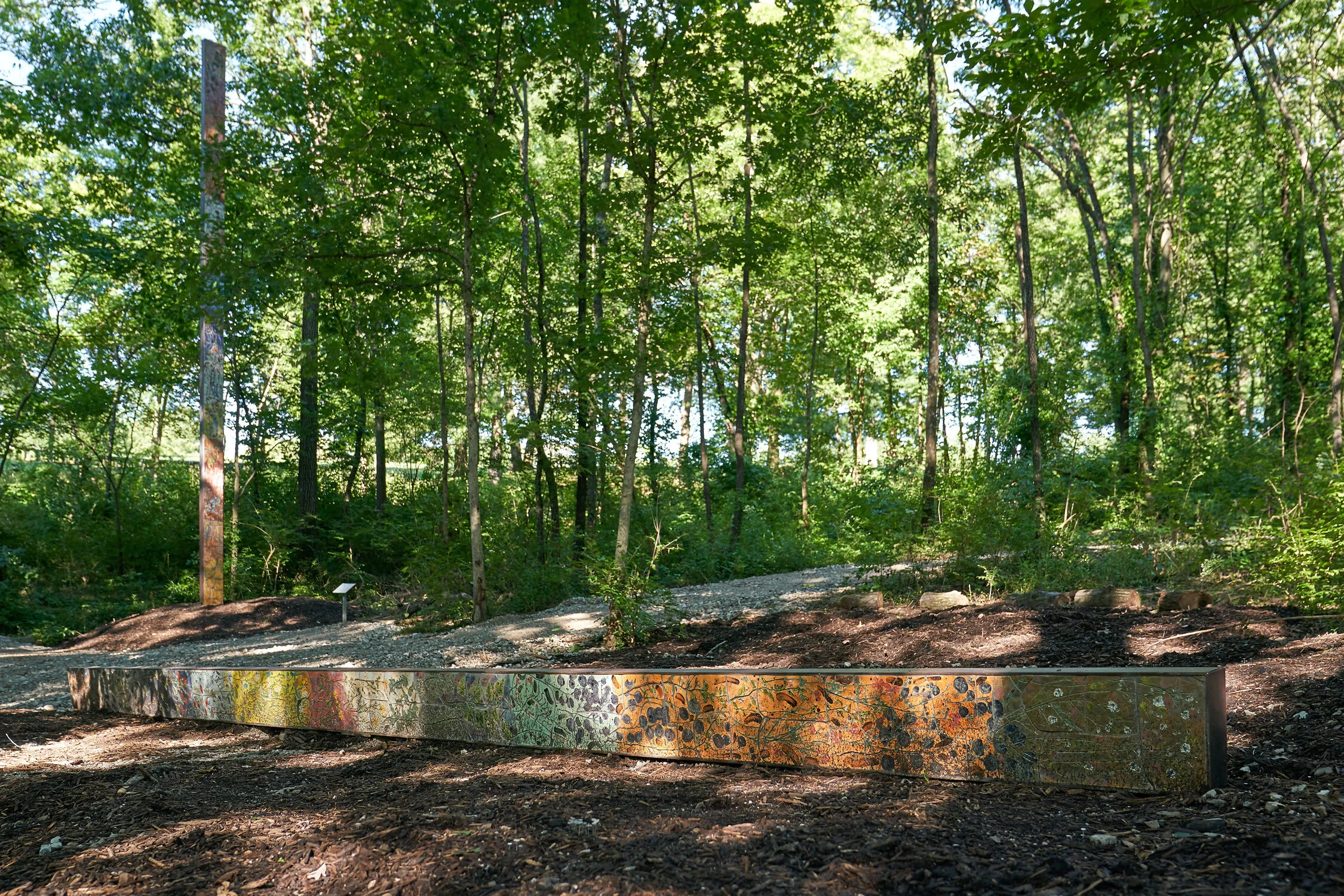 In his metal and ceramic sculpture, Falls layers scavenged branches, twigs and leaves impressing the available flora into clay to create intricate patterns. Falls worked with Laumeier’s master gardener to curate a customized garden of native flowers and grasses. From their research and now flourishing bounty, Falls has expended the resulting species selections on two-monumental sculptures using I-beams and brightly glazed clay tiles.
